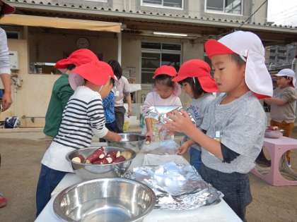 先日、幼稚園で収穫したサツマイモを焼き芋にして食べました。 サツマイモを洗い、アルミホイルで包んだり落ち葉を集めたりなどの準備も、子どもたちが力を合わせて頑張りました。 みんなで食べた焼き芋はとっても美味しかったようで「おかわりください」「2個目も当たりや!めっちゃおいしそうやろ〜」と秋の味覚を味わいました。