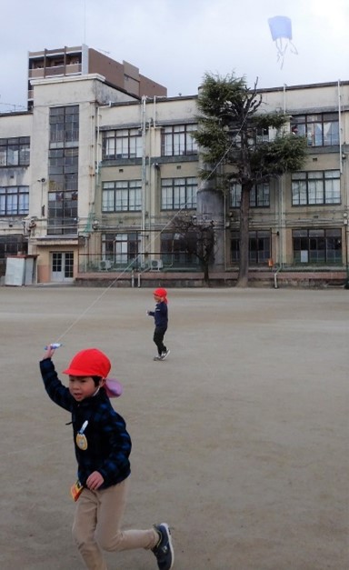 元待賢小学校の広い運動場で、思い切り走ります。風を受けると高く揚がり、いつまでも楽しむ子どもたちです。「今日は風がないからあがらへん」「風があると走らないでもあがる」と遊びながら風を感じるようになっています。