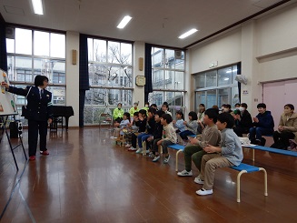 2月21日親子交通安全教室が行われました。横断歩道のわたり方を警察の方から教えていただき、5歳児ことり組は親子で実際に道を歩き、横断歩道をわたる練習をしました。