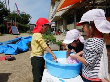 5歳児ことり組が、花の色水と泡を使いジュースを作っていると・・「何してるの?」と4歳児はな組が声をかけてくれ、みんなで美味しいジュースを作って楽しみました。