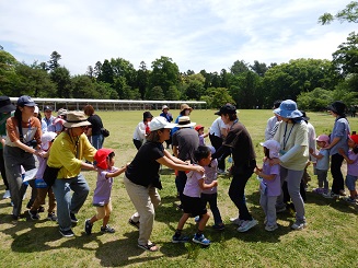 いちご組・はな組・ことり組の親子で「ジャンケン列車」や、子どもたちが大好きな「バナナ鬼ごっこ」を楽しみました。体をいっぱい動かして遊んだ後は、ウォークラリーで自分の好きなバラを見つけたり、おもしろいサボテンを見つけたりと自然に触れることができました。