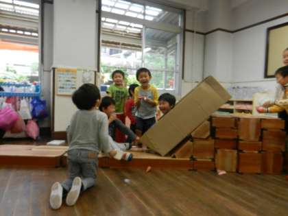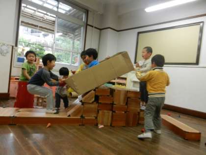 ことり組の子どもたちは,せっせと積木を組み立てて,ダンボール箱をその上に乗せて,箱に乗り込んでいました。何をしているのかなと思っていると「ジェットコースターやねん」ということでした。一度試してみて,ちょっとイメージと違ったのか,みんなで考えて,少し積木の積み方を変えたりして,再挑戦。友達を乗せた箱が傾斜を進むと,みんな満面の笑顔で,成功を喜んでいました。みんなで1つの目的をもってやり遂げた,とても素敵な場面でした。