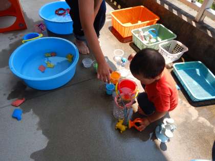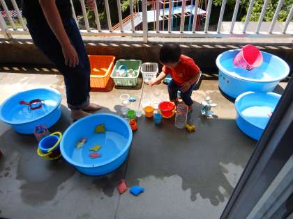外に出て、水遊びをたのしみました。