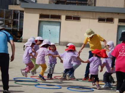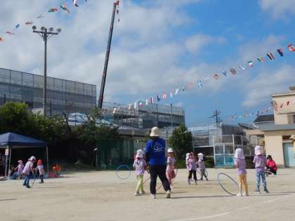 今日は、友達と手をつないでジャンプする技の楽しさがみんなに広がり、「私も、私も」と集まり全員でやってみることになりました。やってみたいことに取り組む日々の遊びの姿です。