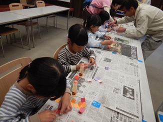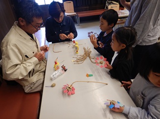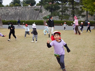 今日は二条城事務所の方たちと一緒に、竹の風車をつくって遊びました。子どもたちの為に、ひとつひとつ丁寧に竹を編んでつくってくださったオリジナルの風車です。完成すると広場に移動して、風車をもって「よーいどん!」と走り出します。「回った!」「もう一回走ろうよ」と嬉しそうに友達と笑い合う姿が見られました。