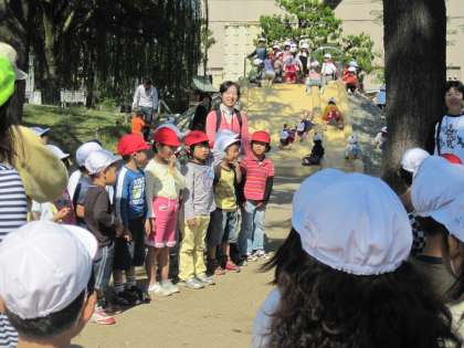 雲一つない秋晴れの日。二条公園に散歩遠足に行きました。たくさんの人たちが遊んでいる中,あれあれ!見たことのある人たちがやってきました。二条城北小学校の1年生です。今日は公園にはどんな遊具があるかな?どんな人たちがいるのかな?の調べ学習にやってきたそうです。中にはお兄ちゃん,お姉ちゃん,そして去年一緒に待賢幼稚園で遊んだお友達もいました。調べ学習が終ったあと,一緒に遊ぶことになりました。グループに分かれて遊具で遊んだり,鬼ごっこをしたりなど楽しいひと時を過ごすことができました。また,一緒に遊ぼうねと約束してわかれました。