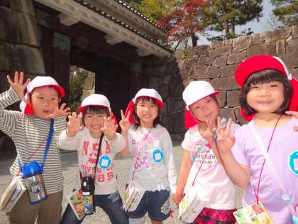 そびえたつ石垣に触れたり,ながめたりしながら,