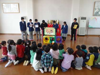 それから,もうひとつのお楽しみがありました。二条中学校のお兄さん,お姉さんが絵本の読み聞かせに来てくださったのです。「まり」「もったいないばあさん」の絵本でした。子どもたちは,お兄さん,お姉さんが一生懸命読んでくれるのを,真剣に見ていました。楽しかったね。二条中学校のみなさん,雪の中来てくださって本当にありがとうございました!また来てくださいね!