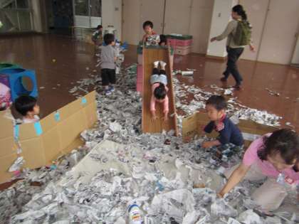 フワフワマットの上に新聞紙をちぎったものを敷き詰めて,滑り台でダイビングしたり,新聞紙で隠してもらって突然出てくるのを楽しんだり,新聞紙の雪を降らせたりしていっぱい楽しみました。