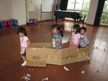 新聞紙の囲いにしていたダンボール箱も,いつのまにやら,「しゅっしゅっぽっぽ・・」と,子どもたちは汽車にして遊びだしていまた。子どもたちの発想は素晴らしいですね。