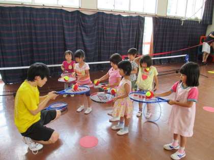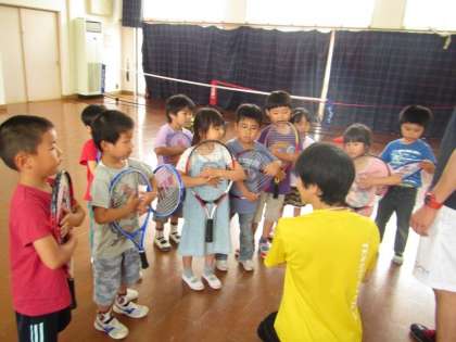 子ども用のラケットも持たせてもらって,子どもたちは目をキラキラさせて楽しく参加していました。