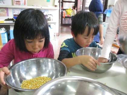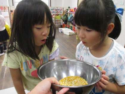 みんなの顔は,コーンの薄皮まみれ…。