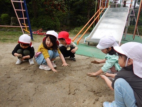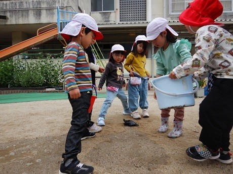 大事な幼稚園の仲間のかめきちくんと散歩をしました。かめきちくんの好きな水をかけたり、足のトンネルをつくったりとかめきちくんと遊んだ後は、「ここめっちゃムニムニで気持ちいい!」と、どろんこ遊びを楽しみました。