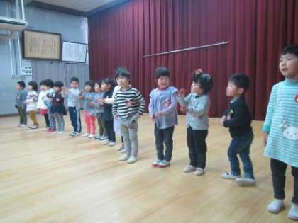 4歳児たんぽぽ組の子どもたちは,登園してきた時から「今日が本番やなぁ!」と,ウキウキしている様子でした!歌を歌う時に遊戯室に入ると,たくさんのお客様の中から,お家の人を一生懸命に探して手を振る姿が見られました。