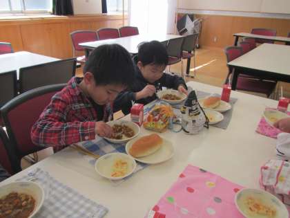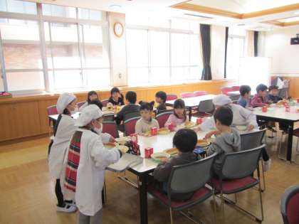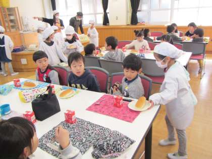 年長児すみれ組の子どもたちは,隣接している乾隆小学校へ行って,給食をいただきました。ランチルームで1年生が給食を配膳してくました。テキパキと自分たちで給食を配っていく1年生の姿に「すごいなぁ〜」という眼差しで見ている子どもたち。今日のメニューはチリコンカーンとジャガイモのソテー,コッペパンに牛乳でした。「おいしい〜!」「カレーみたいな味がする!」「もっと食べたい!」と大喜び。みんな残さずに全部食べました。牛乳パックを畳んだり,お皿やスプーンなどを片付けたり,後始末も自分でバッチリできました。「早く小学校で給食食べたいー!!」と楽しみにしています。1年生からは,お手紙の書かれた心のこもったメダルをもらい,嬉しそうに首にかけて帰りました。乾隆小学校の皆さんありがとうございました。