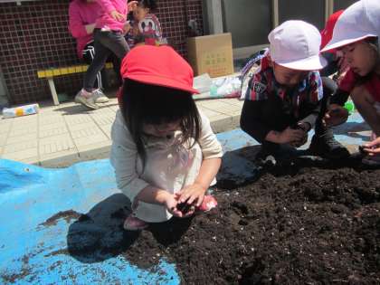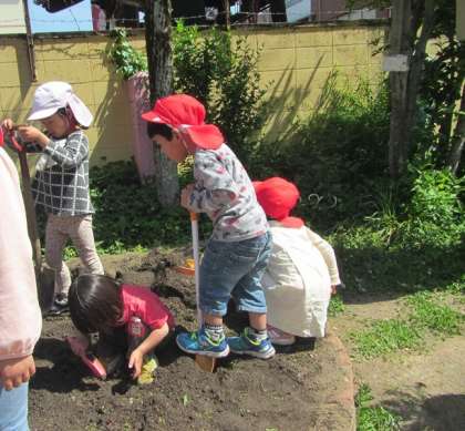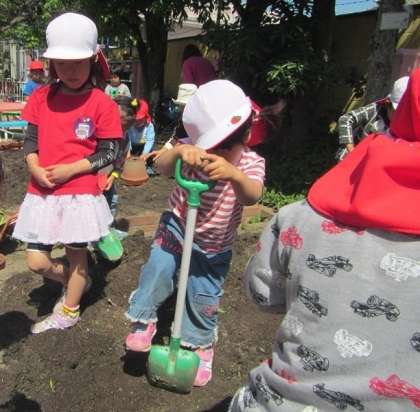 年中児、年長児が栽培の土づくりを始めると…