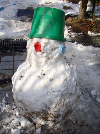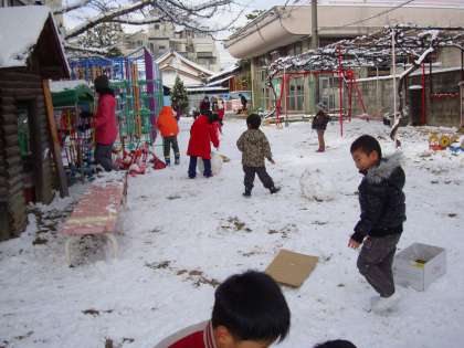 園庭にはまだふかふかの雪が残っていて,登園すると,「雪であそぼう!」「外行こう!」と,さっそく園庭にでて遊びました。