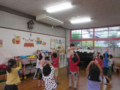 今日の預かり保育は「歌って遊ぼう!」でした。園長先生と唱歌をうたいました。「どんぐりころころ」や「チューリップ」は知ってる!と嬉しそうでした。昔から歌われていたことを聞くと,「へ〜〜,そうなんか」と頷いていました。また,お芋堀のダンスやフォークダンス等,リズムを感じて全身で楽しました。歌うこと,リズムを感じて体を動かすこと,友達と一緒だと楽しいですね!笑顔いっぱいのひと時でした。