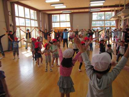 年長児すみれ組の子どもたちは前に並び,「ぼくたち,私たち,先生だよ!よく見て踊ってね!」と張り切って体を動かし楽しんでいました。もうすぐ運動会です。当日,おうちの人と一緒に踊るのが楽しみな子どもたちです。おうちの方もどうぞ,楽しんでご参加くださいね。よろしくお願いします!