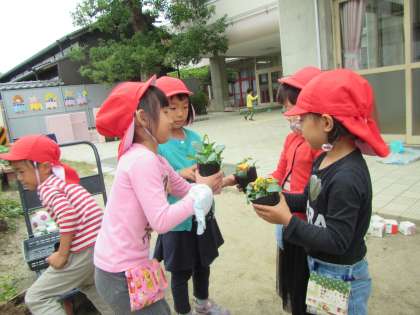 春は年長さんがしていた花の苗植え。「任せるね!」と頼まれ,今度は自分達がやるんだというはりきる気持ちで引き継ぎました。