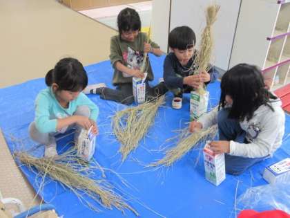 牛乳パックに稲穂を入れて、