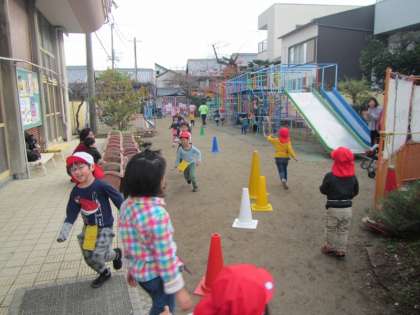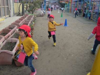 細長〜い園庭をぐるっとまわって1周!