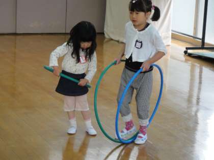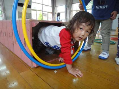 年長児にフープの仕方を教えてもらったり,トンネルをくぐっている
