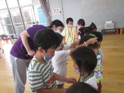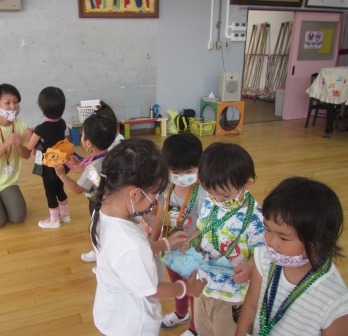 今日は,年長組から年少組へ,”これからもよろしくねのメダル”を