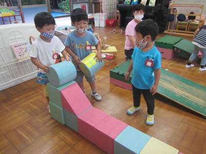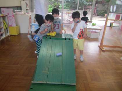 3歳児ちゅうりっぷ組では,円柱の積み木を転がして遊んでいたことをきっかけに,もっと遊びが楽しくなればといろいろな坂を用意しました。コロコロと転がっていくことが面白いようで,ボールやペットボトルのキャップ,丸い木片などいろいろなものを転がしてみていました。
