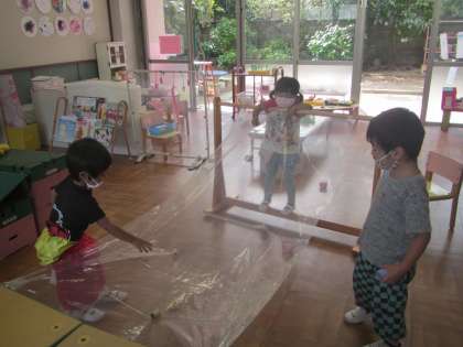 新しく用意した透明のビニールでつくった坂は,転がしても真っすぐには進んでいかず,転がりながらいろいろな方面に進みます。一度にたくさん転がしてみたり,そっと転がしてみたりしながら,思いがけないところに転がっていく面白さを感じていました。