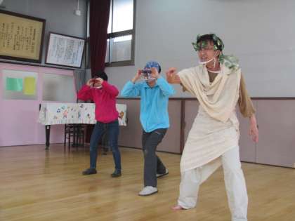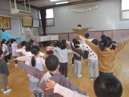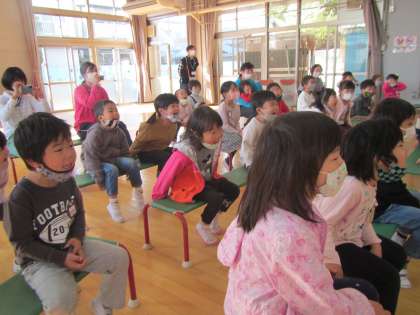今日は,文化芸術授業で,プロの役者さんが幼稚園に来てくださり,演劇のデモンストレーションを見たり,一緒に動きを楽しんだりしました。迫力のある動きやセリフを間近で見ることができ,子どもたちも引き込まれていました。