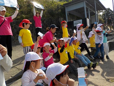 子どもたちも「園長せんせ〜い!」「おかあさ〜ん!」と叫びながら一生懸命鏡を揺らしていました。