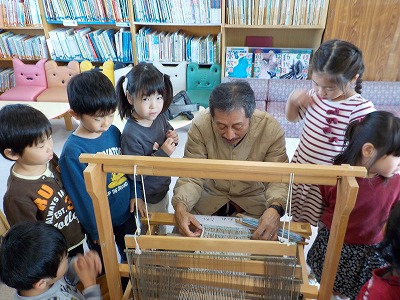 今日は幼稚園の近くでお仕事をされている高橋さんに幼稚園にきていただきました。高橋さんは織機の製造やお直しをされている方です。