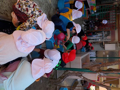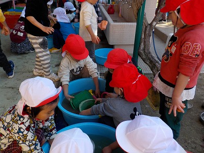 昨日は、保育室の大掃除をして、今日はみんなで砂場の玩具をお湯でピカピカに洗いました。