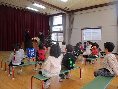 そして2学期終業式では、園長先生にしめ縄や冬休みの過ごし方についての話を聞きました。