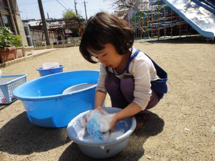 園庭にタライや水遊びの道具類を出しておくと,道具類のかごから