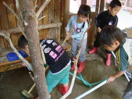 先週,年長組の生活グループを決めました。グループの名前を決めるのに,30分以上かかったグループもありましたが,どうにか,グループ名も決まり,今日は初めて,グループで飼育小屋の掃除をしました。