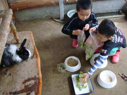 野菜を切ったり,小鳥のえさの殻をとばしたり,4人みんなで力を合わせて,お世話をしました。