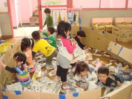 大きなプールに新聞紙をいっぱい破いて,新聞プールにしました。