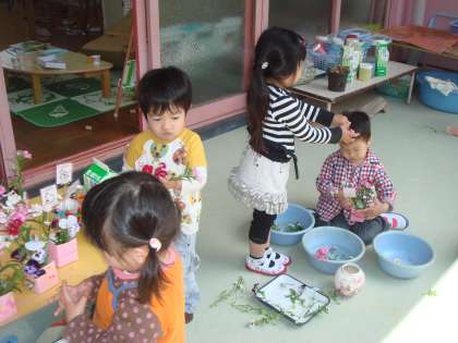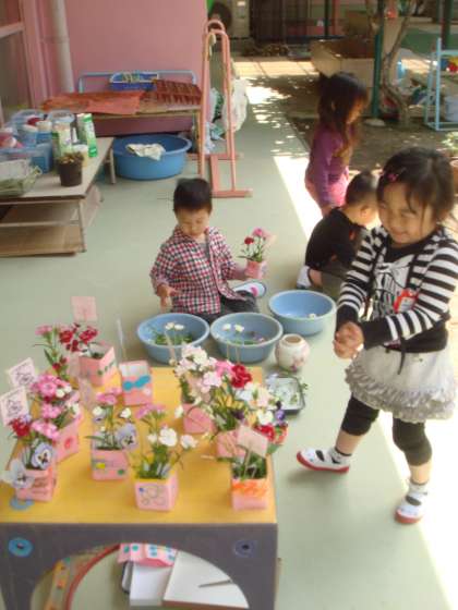 オアシスに花をさすのに少し苦戦していましたが,「お母さんピンクのお花が好きやわ」「いいにおいがするで!」と言いながら一生懸命思いを込めてつくっていました。