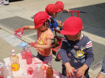 すると子ども達は,自分で色水をつくったり,混ぜたりしながら