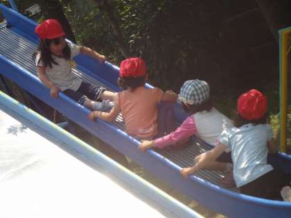 一緒に滑り台を滑ったり,友達と三輪車に乗ったりして遊んでいました。