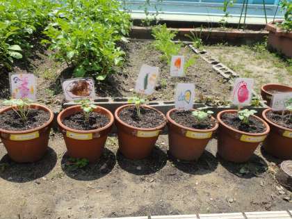 その後金曜日に植えたオクラの名札をつくって立てました。