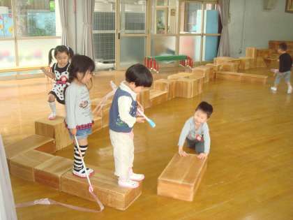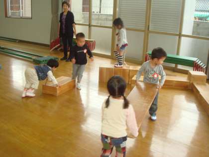 「道がありませ〜ん!」と迷路を通っている子どもが言うと,「はいはい!」と,どんどんつなげていくので,遊戯室がその迷路でいっぱいになりました。
