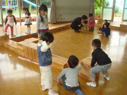 年長児が並べてつくっていた積み木の囲いに「お風呂みたいや〜」と言って入っている子どももいました。