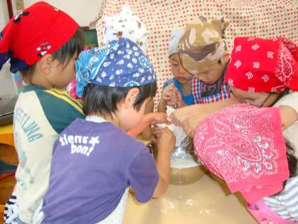 粉を入れたり,混ぜたりして,ポットプレートに入れ,ふたをすると,子どもたちの「おいしくな〜れ。おいしくな〜れ」の大合唱。