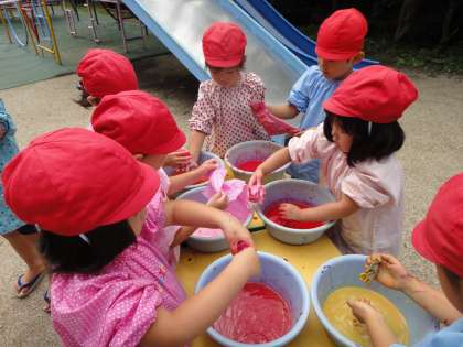 一度に全部つけてしまう子ども,少しずつ染まっていく様子を