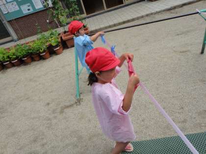染め紙をロープに吊るして洗濯バサミで止めるのも楽しいようでした。