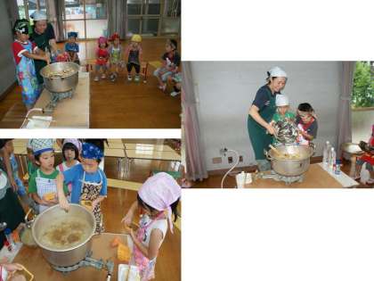年少組と年中組が洗ったり皮をむいてくれたりした野菜を,年長組の子どもたちは,切ったり,炒めたりしました。