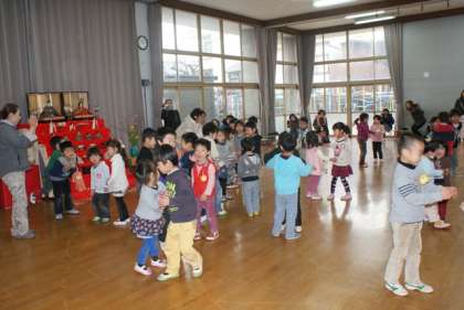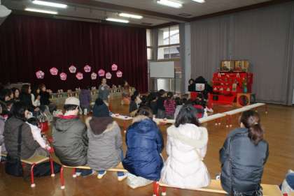 「つどい」では,歌を歌ったり,お話を聞いたり,紙芝居を見たりした後,ひなあられと白酒に見立てた乳酸菌飲料をいただきました。おひな様ゲームは,「三人官女。」なら3人組。「五人囃子。」なら五人組。というふうに音楽が終わったときの掛け声をよく聞いてその人数だけお友達が集まるというものでした。